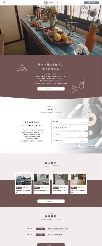 風水を取り入れた、リフォームや家具などのインテリアコーディネートなどの施工事例や、新着情報を掲載し、心くつろげる雰囲気のホームページになりました。